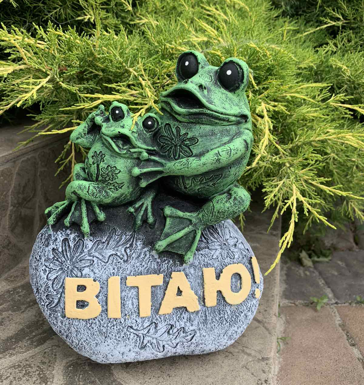 Фігурка кумедних жабок з надписоі Вітаю, порадує кожного. Ідеальна прикраса для ставка, саду, тераси або ресторану. Фігурка виготовлена з високоякісного архітектурного бетону , стійкого до складних погодних умов.