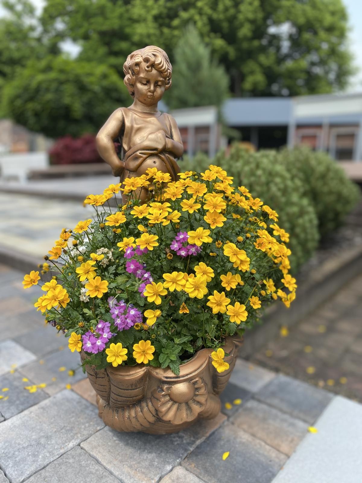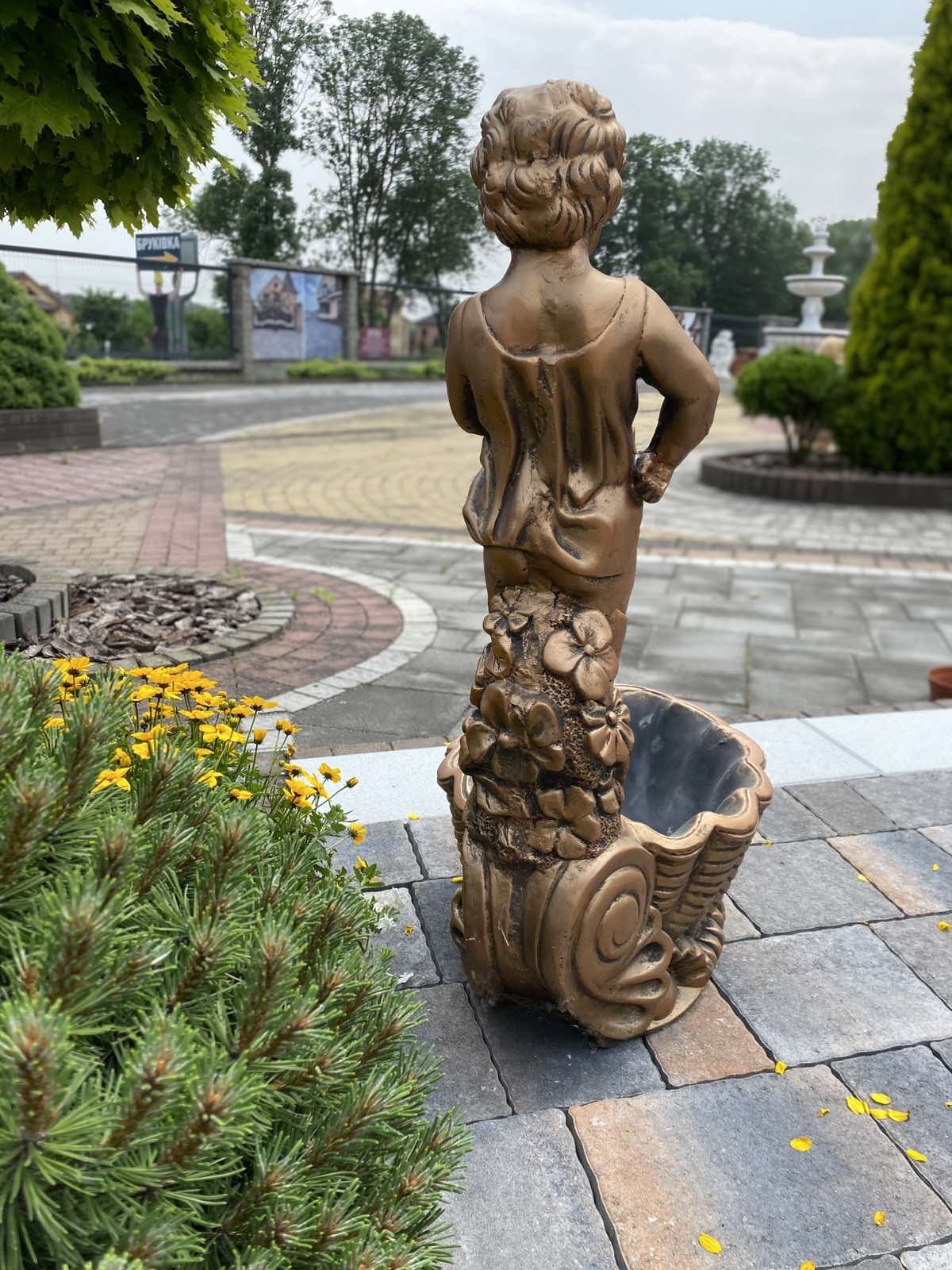 Незвичайна фігура хлопчика, що стоїть над декорованою ракушкою. Фігура виготовлена з високоякісного бетону стійкого до будь-яких погодних умов (дощ, сонце, мороз). Гарна прикраса домашнього саду , громадських місць, парків, готелів.