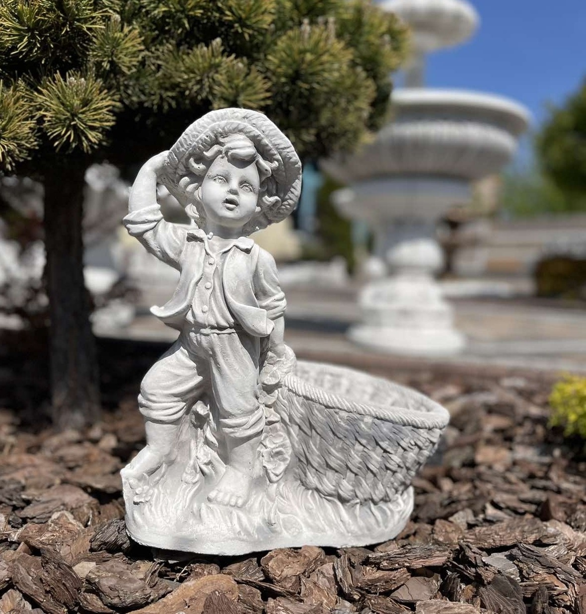 Невелика фігурка - чарівного хлопчика, який тримається за капелюшок. Фігура виготовлена з високоякісного білого бетону , стійкого до будь-яких погодних умов (дощ, сонце, мороз). Прекрасна прикраса для домашнього саду, громадських місць, парків, готелів .