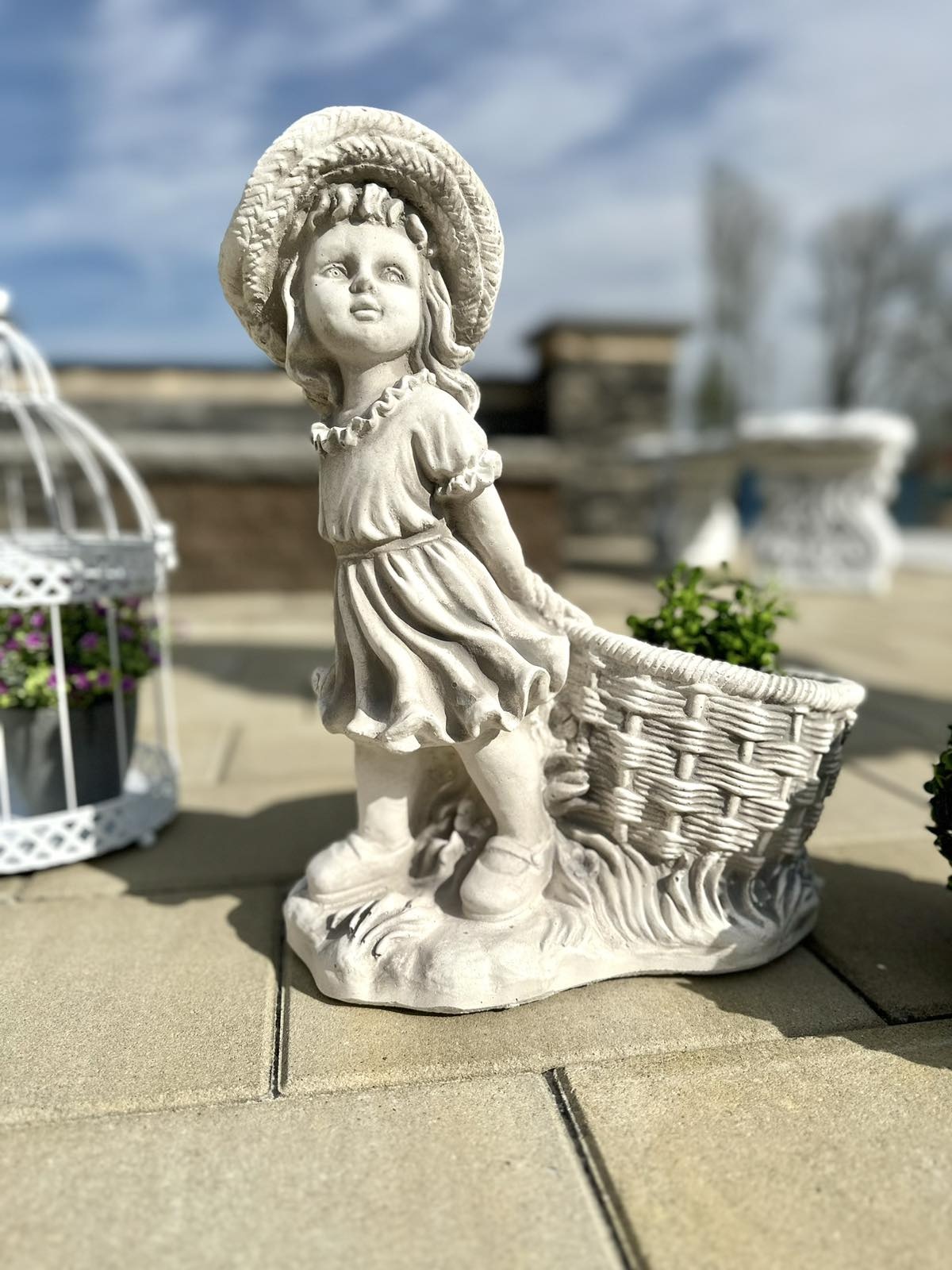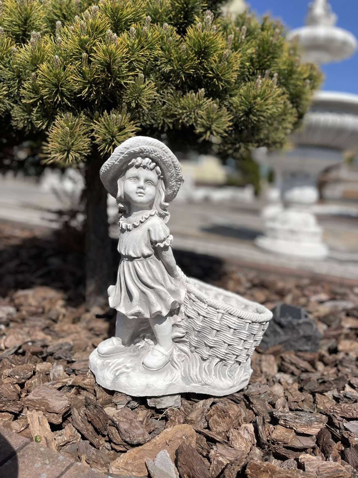 Невелика фігурка - дівчинки в капелюшку, яка має чашу для висадження квітів. Фігура виготовлена з високоякісного білого бетону , стійкого до будь-яких погодних умов (дощ, сонце, мороз). Прекрасна прикраса для домашнього саду, громадських місць, парків, готелів .