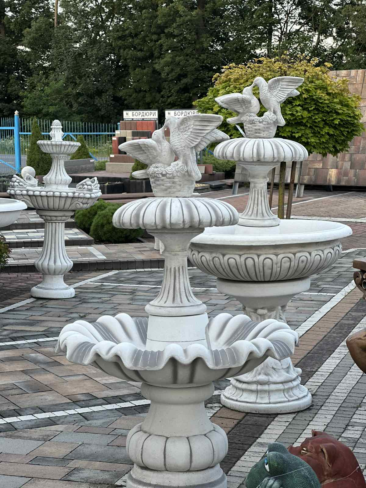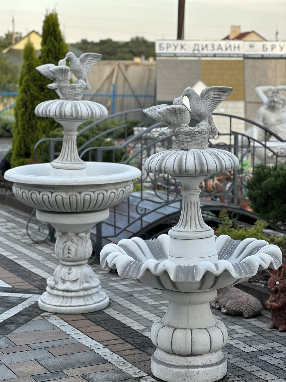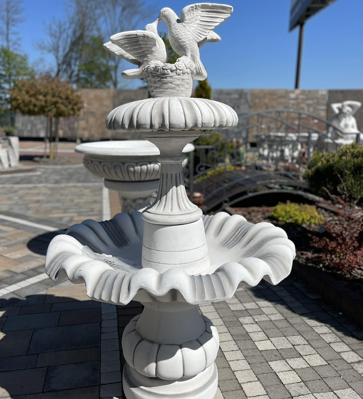 Дворівневий фонтан із закоханими голубами в літні дні не тільки порадує око, а й додасть прохолоди та свіжості. Ця класика додасть гідності будь-якому зеленому куточку. Весь виготовлений з високоякісного архітектурного бетону, стійкого до будь-яких погодних умов (дощ, сонце, мороз).