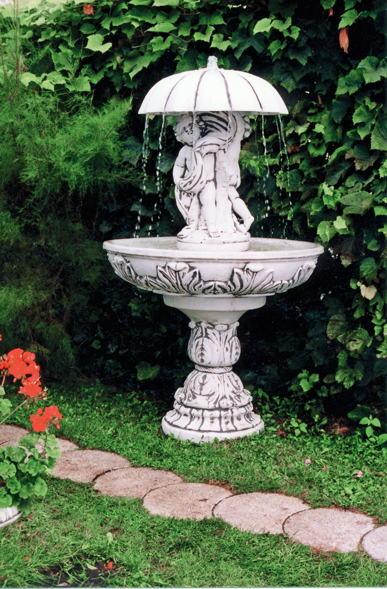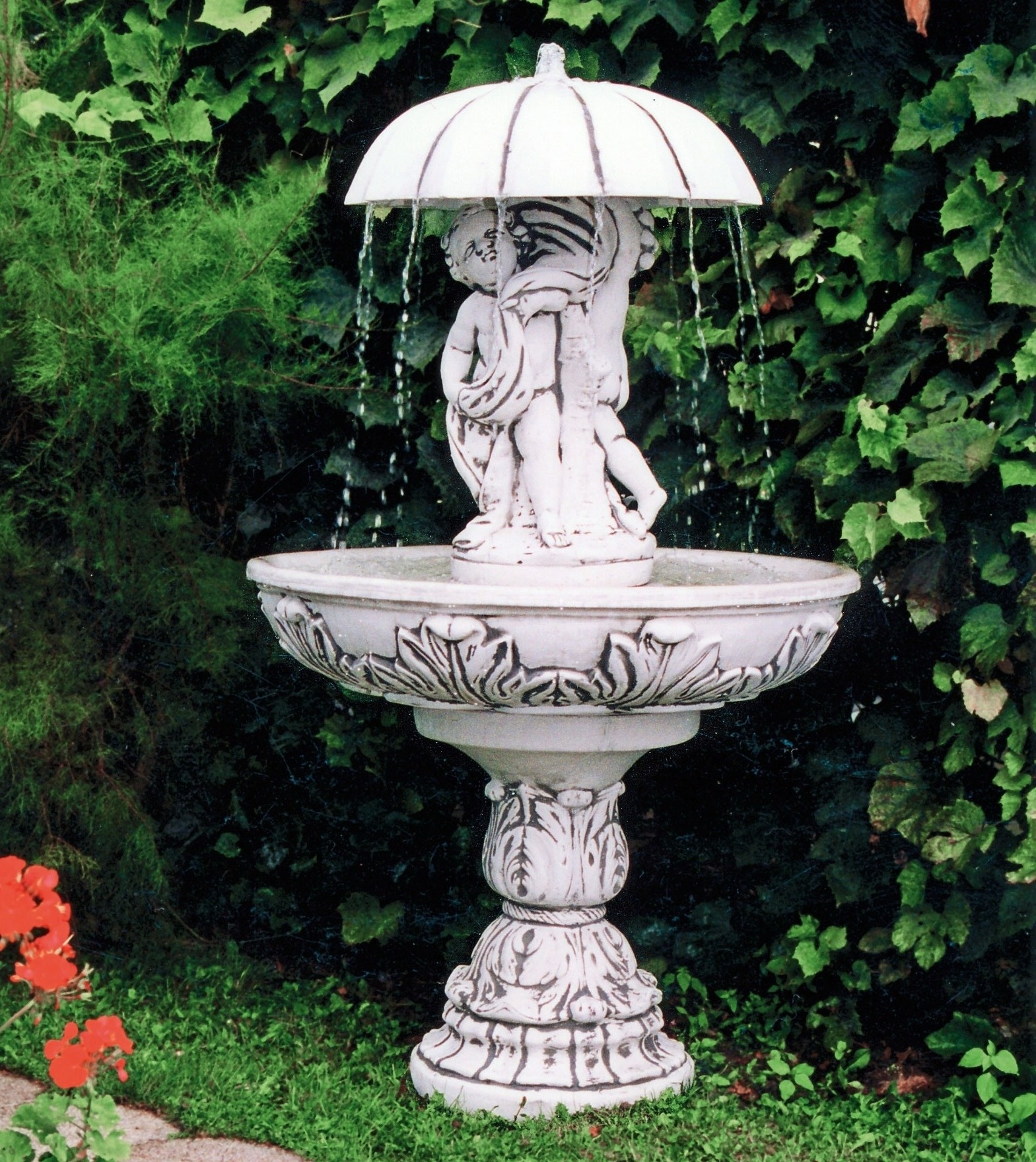 Декоративний фонтан із фігурою дітей під парасолькою, над якою тече вода. Фонтан, безсумнівно, додасть гідності і стане прекрасною прикрасою саду, тераси, ресторану або громадського місця. Його виконання - висококласний архітектурний бетон, який стійкий до погодних умов, таких як дощ, сонце, мороз.