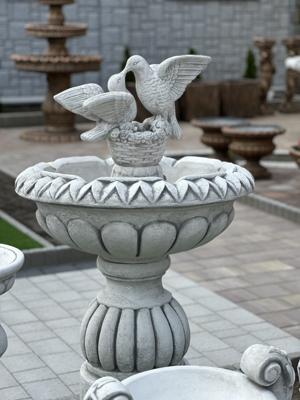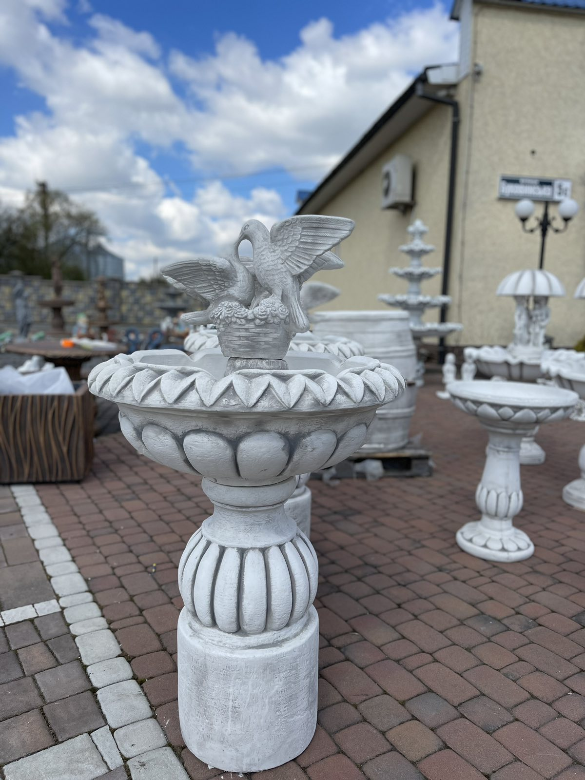 Одноярусний фонтан, увінчаний фігуркою чарівних голубів. Зроблений з особливою ретельністю, він не тільки розслабить вас звуками води, але й додасть прохолоди та свіжості в спекотні дні. Весь виготовлений з високоякісного архітектурного бетону, який стійкий до погодних умов (дощ, сонце, мороз).