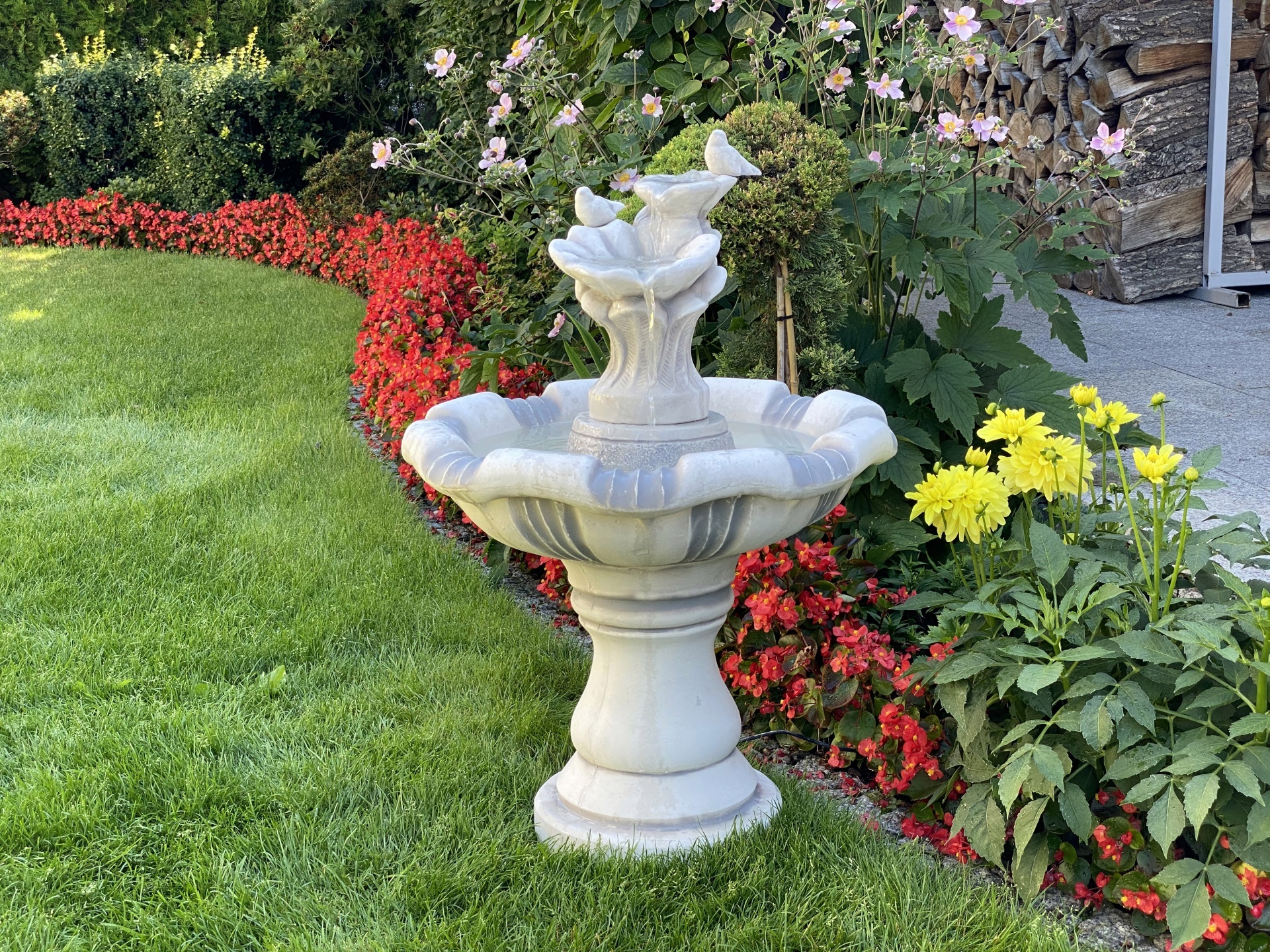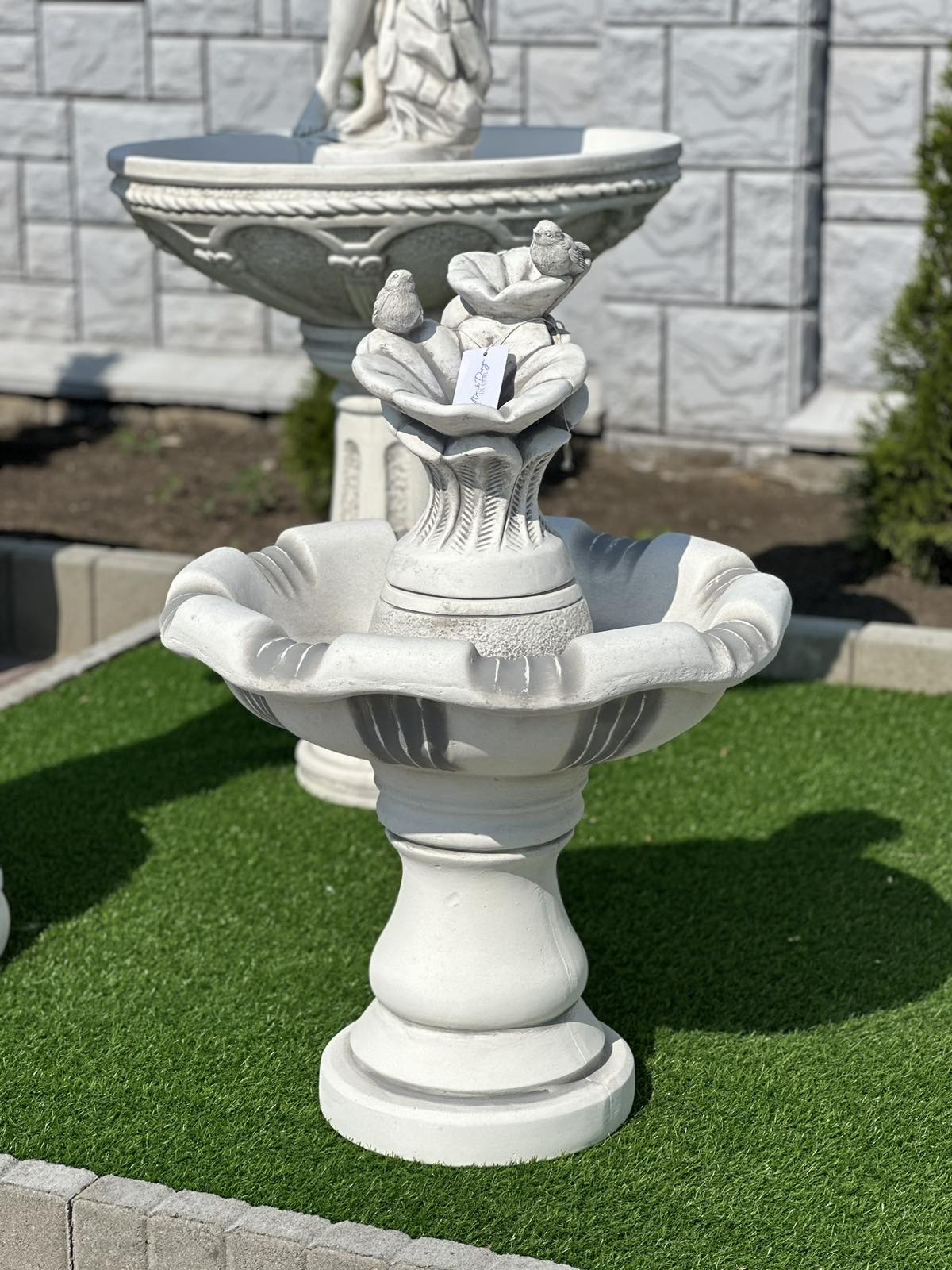 Красивий класичний фонтан із декором птахів, увінчаний лілією, з якої ллється вода. Зроблений з особливою ретельністю, він, безсумнівно, додасть гідності оточенню, а поточна вода розслабить нас своїм шумом. Продукт стійкий до погодних умов (дощ, сонце, мороз).