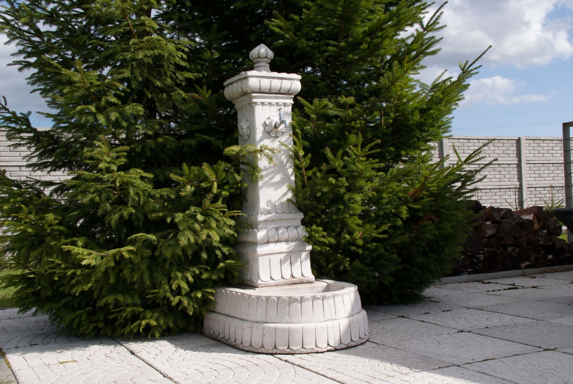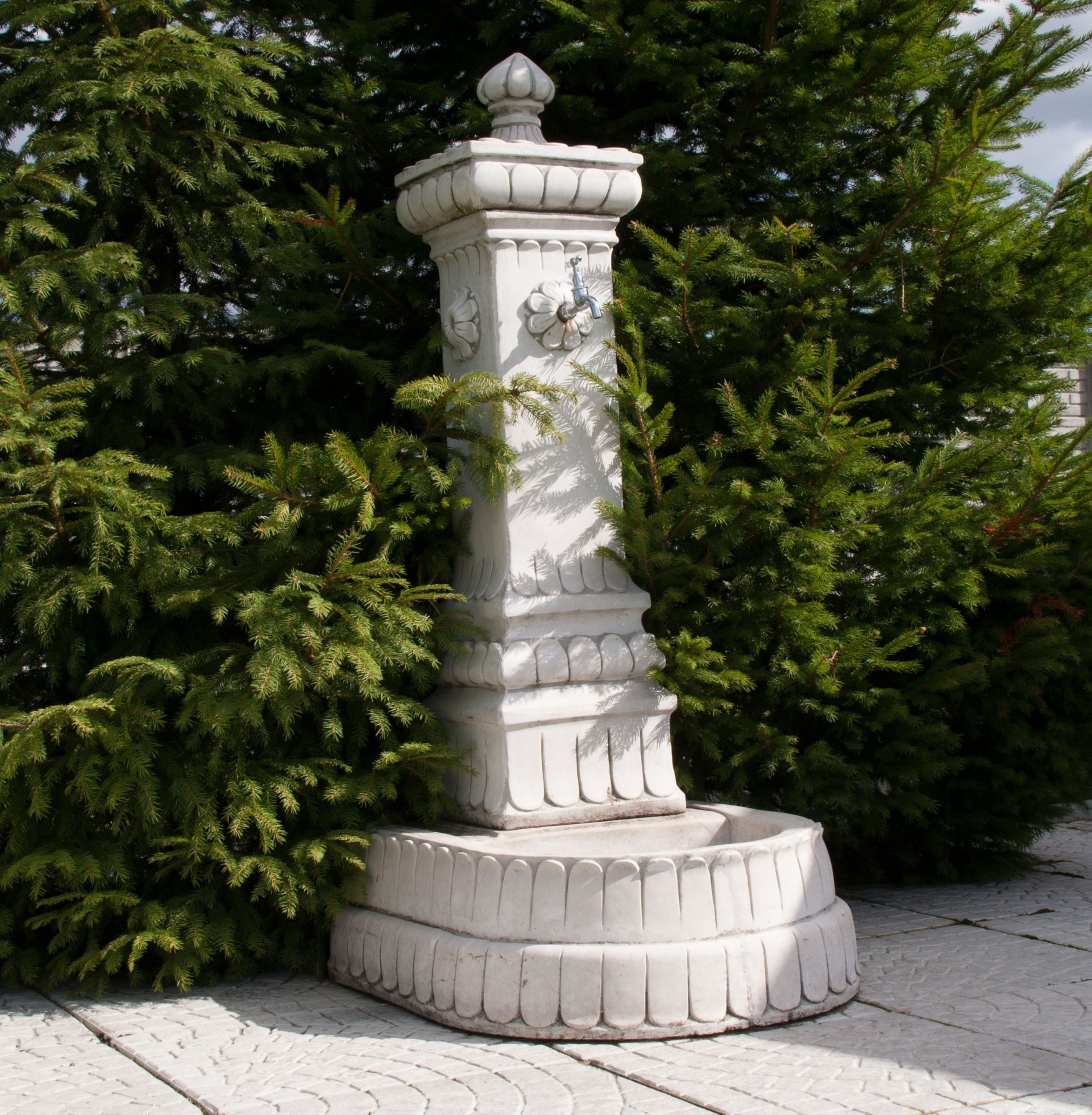 Джерельний фонтан - окремо стоячий варіант. Він стане чудовою прикрасою для садів, оформлених у класичному стилі. У літні дні він не тільки порадує око, а й додасть прохолоди та свіжості. Весь виготовлений з високоякісного білого архітектурного бетону, стійкого до будь-яких погодних умов (дощ, сонце, мороз).