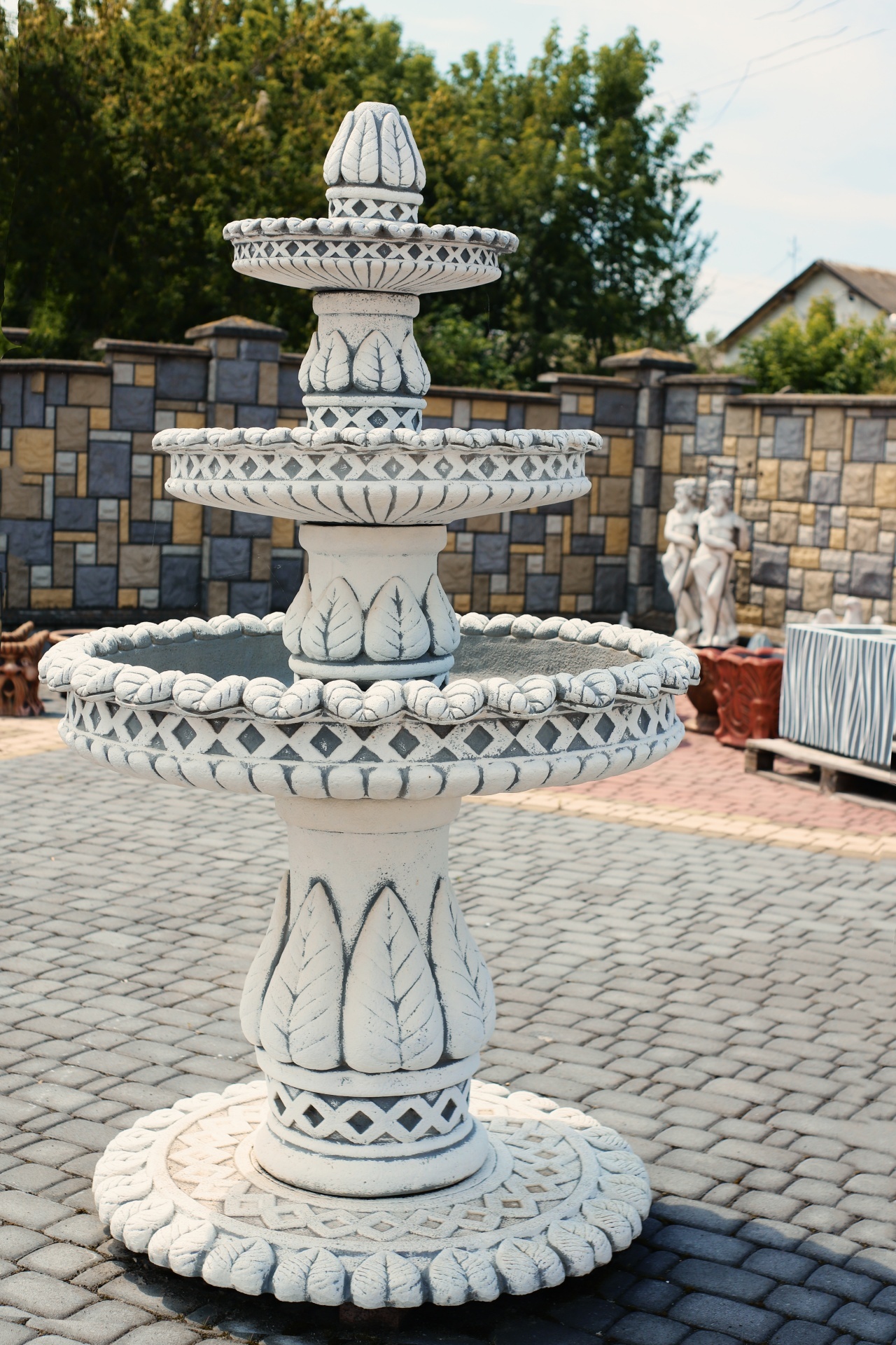 Елегантний бетонний садовий фонтан має цікаві форми чаш та контур для води - прекрасна прикраса для саду. Бетонні фонтани морозостійкі. Взимку воду необхідно зливати. Садовий фонтан виготовлений з високоякісного білого бетону і злегка патинований, щоб підкреслити чарівність дизайну.