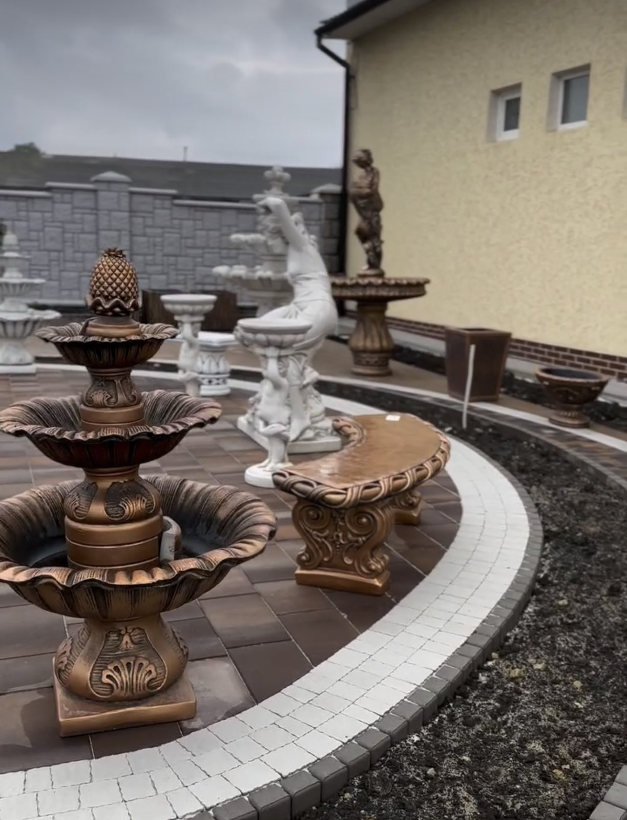 - всі комплектуючі до фонтану (ніжка, чаша, підставки, декор, якщо він входить до товару) від виробника, повністю пристосовані для самостійного монтажу;
