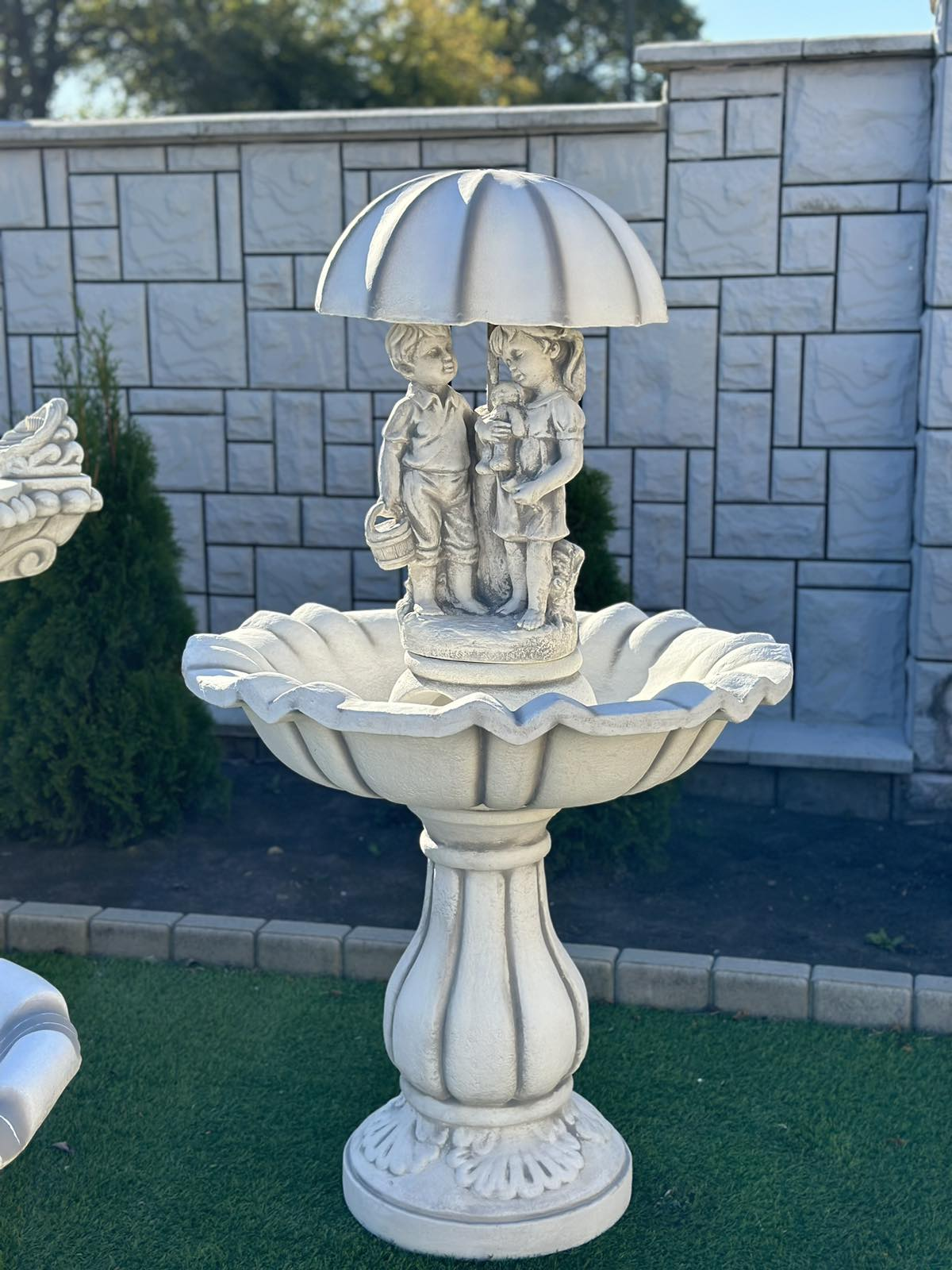 Його люблять діти і дорослі! Фонтан із фігуркою дітей, що стоять під парасолькою в літні дні, не тільки порадує око, але й додасть прохолоди та свіжості. Весь виготовлений з білого архітектурного бетону високого класу, стійкого до будь-яких погодних умов (дощ, сонце, мороз).