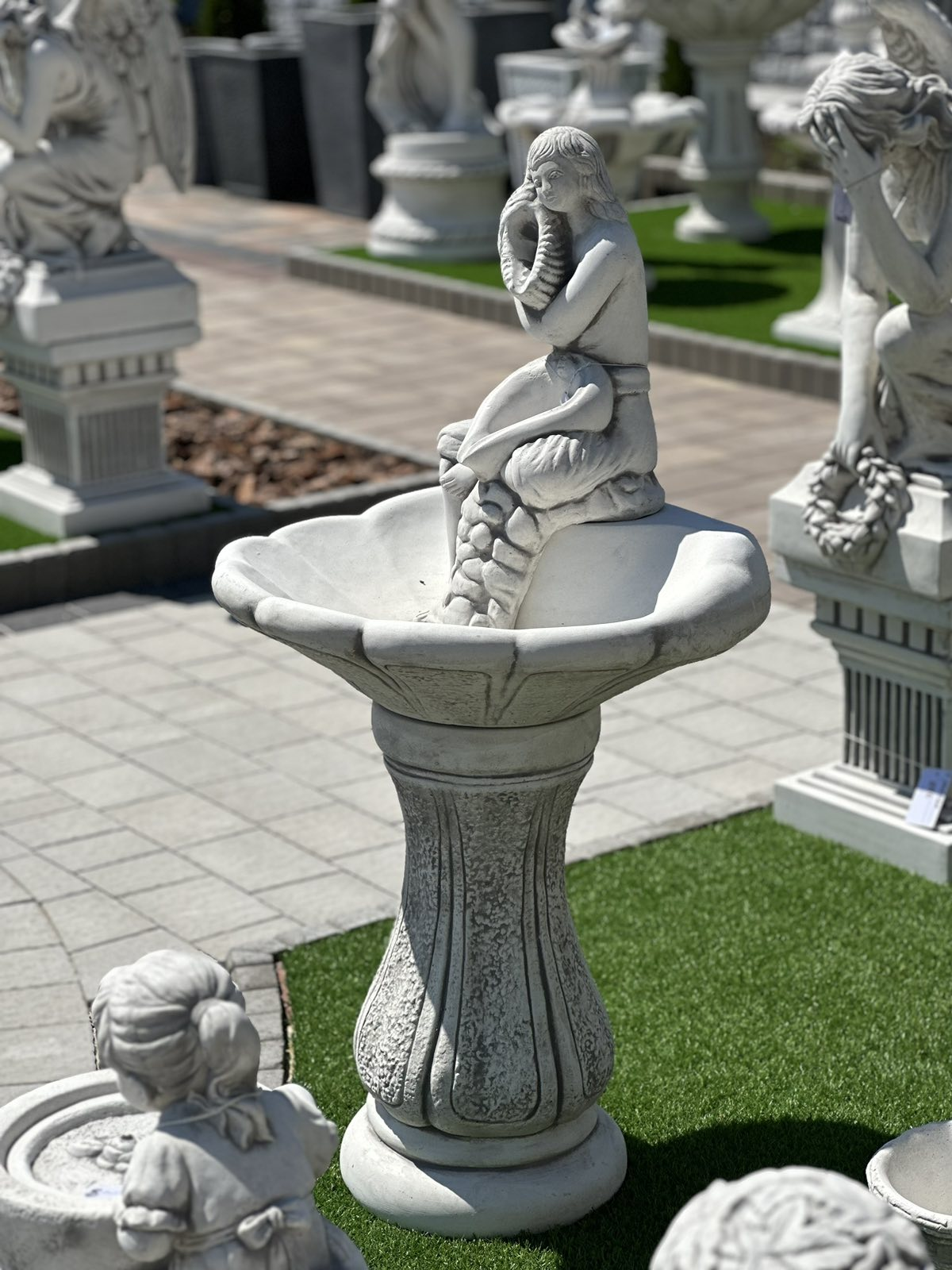 Ефектним доповненням саду, оформленого в класичному стилі, стане витончений фонтан, вода якого тече з мушлі, яку тримає жінка. У літні дні він не тільки порадує око, а й додасть прохолоди та свіжості. Все це зроблено з білого архітектурного бетону високого класу, стійкого до будь-яких погодних умов (дощ, сонце, мороз).