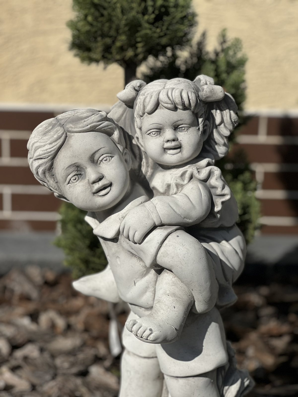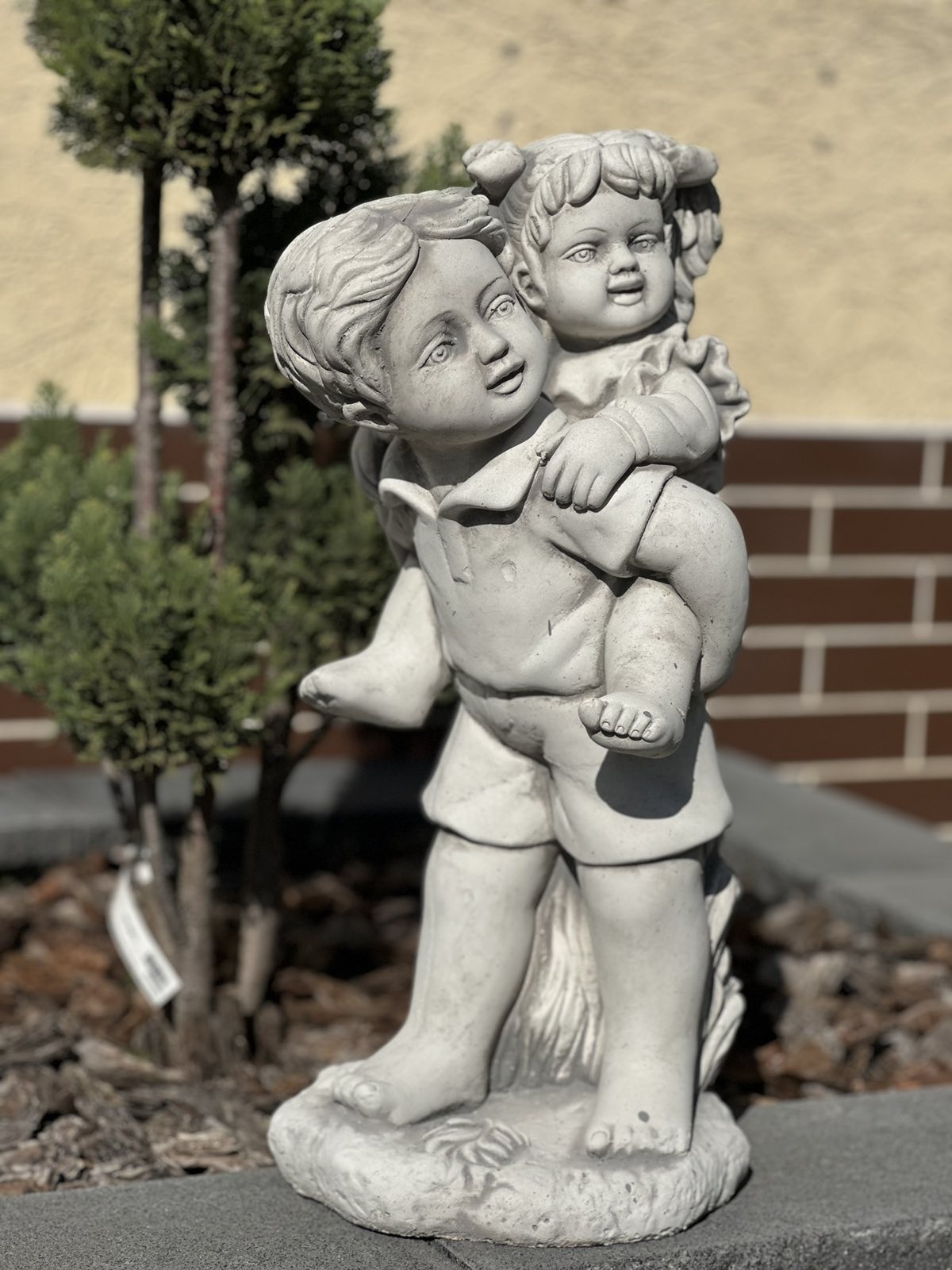 Садова скульптура “Братик і сестричка” – зворушливий символ дитячої радості, тепла та безтурботності. Фігурка зображає маленького хлопчика, який весело несе на спині свою сестричку, передаючи атмосферу щирої любові й сімейного затишку.