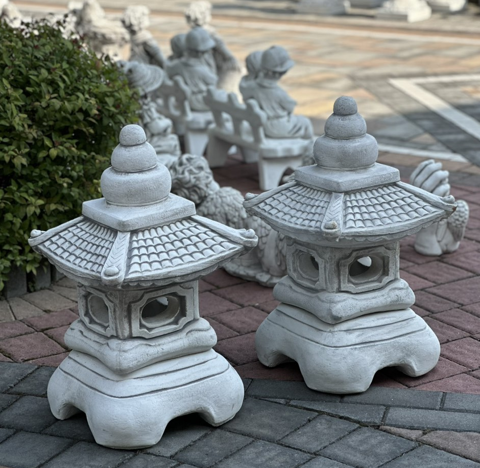 Японська пагода з віконцем, виготовлена з високоякісного білого бетону, стійкого до будь-яких погодних умов (дощ, сонце, мороз). Красива і незвичайна прикраса для домашнього саду.
